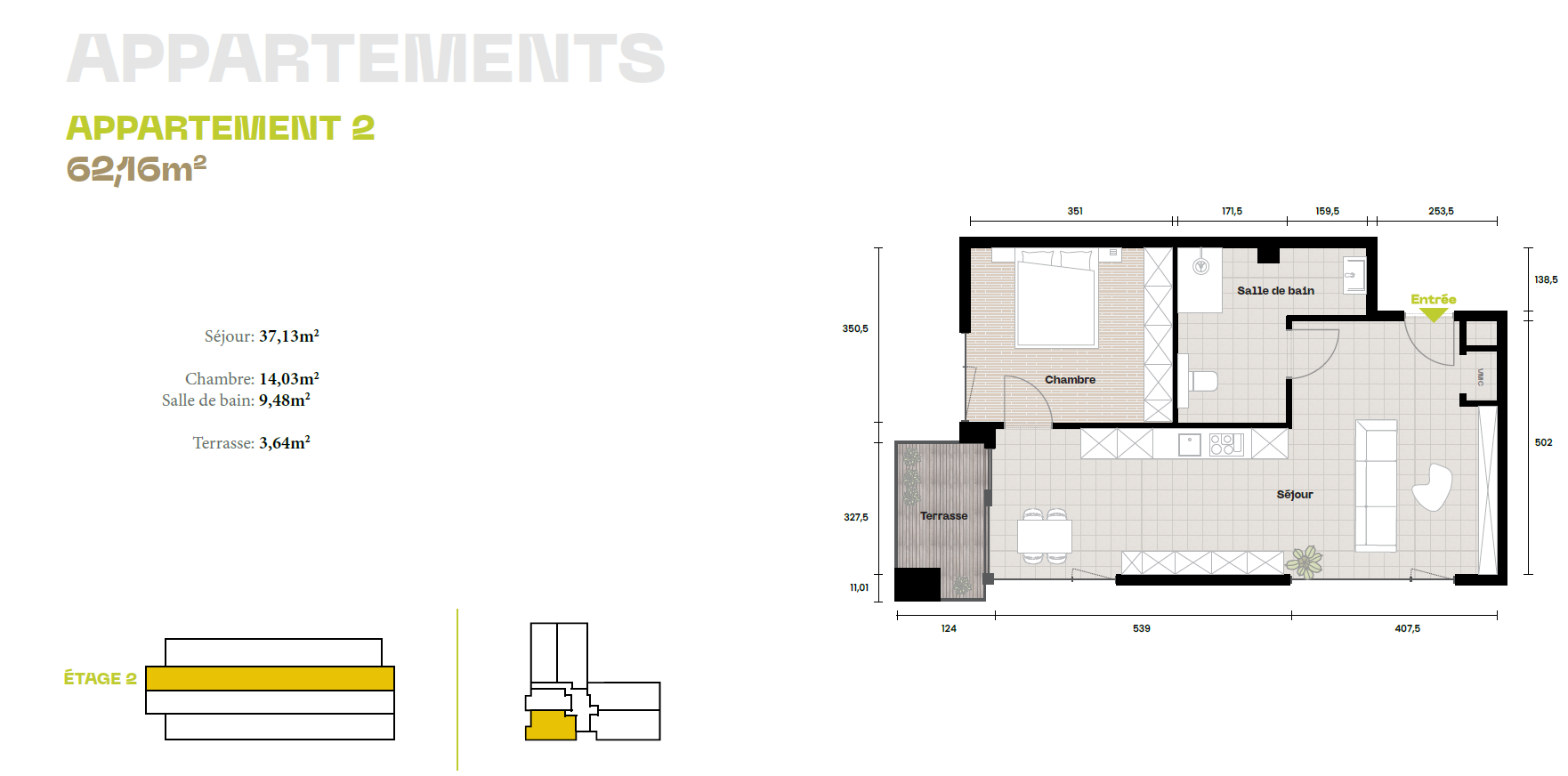 Situé au 2ème étage avec ascenseur, cet appartement 1 chambre à coucher (App 002 – 052) est agencé comme suit :