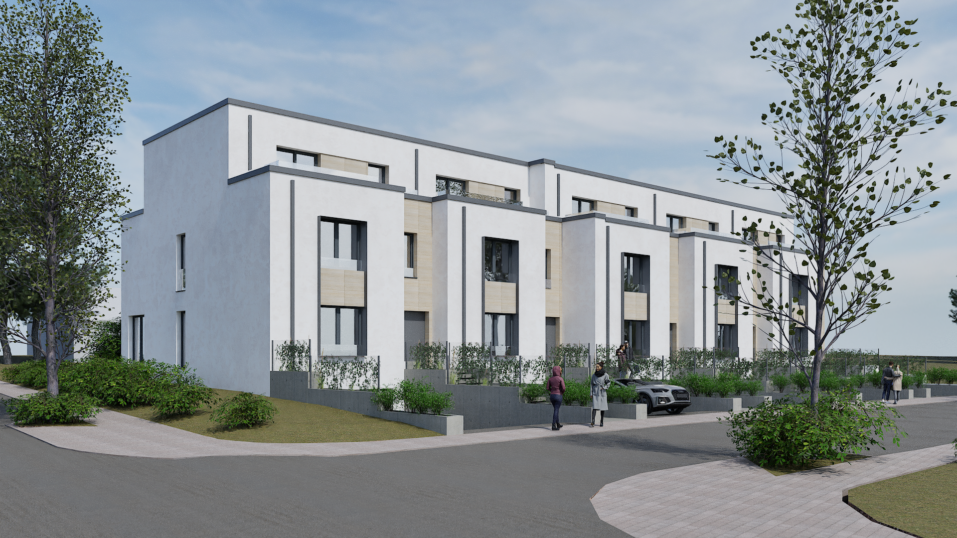 A l’étage en retrait : 2 chambres à coucher, dont une avec une salle de bain privative. Cet étage se complète par deux terrasses de 14m² et de 17m².