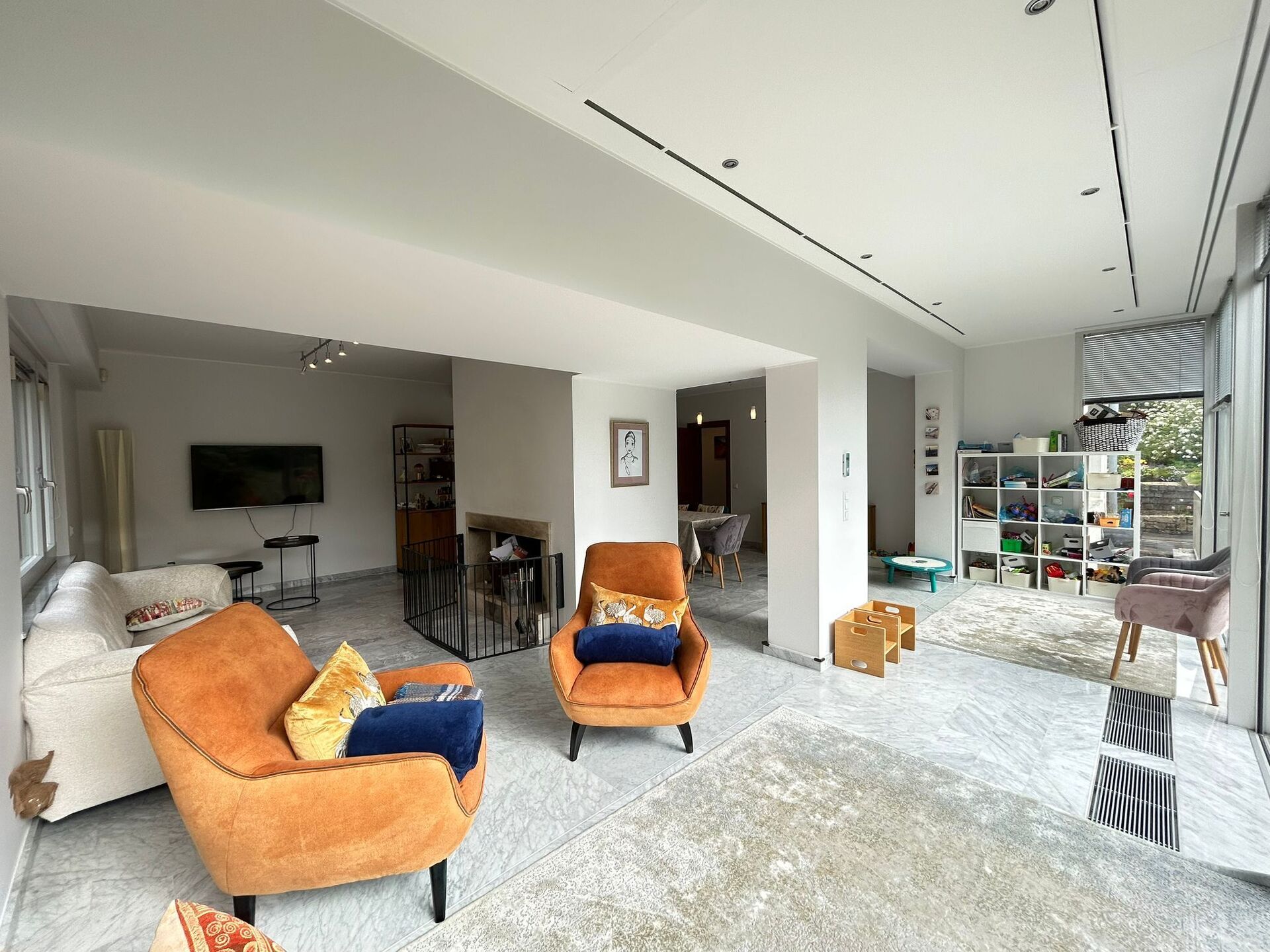 Ground floor: an entryway with built-in closets, a separate toilet, 1 bedroom, an office, a separate fully equipped kitchen with access to the garden, a storage room, and a living/dining room with a fireplace and access to the terrace and garden.